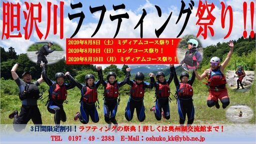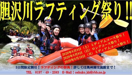 ISAWAGAWA Adventure Rafting Tour 開催3周年記念!2020年8月8日(土)から10日(月)までの3日間、ラフティングで盛り上がれ!3日間の限定割引あります!通常ミディアムコースお一人様4,000円を3,500円!ロングコースお一人様7,000円を6,500円!さらに3日間とも9:30集合のコースのみ1000円引き!ミディアムコースはお一人様3,000円!ロングコースはお一人様6,000円!早起きは三文の得、どころではない!ご予約はお早めに!ご予約・お問い合わせは奥州湖交流館までTEL 0197-49-2383 E-Mail:oshuko_kk@ybb.ne.jp日程はこちら!2020年8月8日(土)ミディアムコース祭り!・奥州湖交流館集合・集合時間 午前 9:30、11:00 午後 13:30、15:00・ウエットスーツの貸し出しはございません。ヘルメット、ライフジャケットはお貸しいたします。濡れてもいい靴をご用意ください。・料金 9:30のみ¥3,000-(1000円引き!レンタル、保険、税込み)11:00、13:30、15:00は¥3,500-(500円引き!レンタル、保険、税込み)・集合時、ラフティングができる格好で来てください。虫や日焼け予防の為、水着などを着用した上に長袖のジャージなどをおすすめします。・小学4年生以上(小学生、中学生は保護者同伴)参加可・東北6県在住の方が対象となります。他の地域の方は申し訳ありませんがご遠慮ください。・集合時に体温測定を行います。37.5度以上の方は参加をご遠慮していただきます。・必ず奥州湖交流館ホームページ内の「新型コロナウイルス対策について」「ラフティング質問ページ」等をお読みください。2020年8月9日(日)ロングコース祭り!・奥州湖交流館集合・集合時間 午前 9:30 午後 13:00・ウエットスーツ、ヘルメット、ライフジャケットはお貸しいたします。濡れてもいい靴をご用意ください。ウエットスーツの下に着る水着やTシャツ等もご用意ください。・料金 9:30は¥6,000-(1000円引き!レンタル、保険、税込み)13:00は¥6,500-(500円引き!レンタル、保険、税込み)・高校生以上参加可・東北6県在住の方が対象となります。他の地域の方は申し訳ありませんがご遠慮ください。・集合時に体温測定を行います。37.5度以上の方は参加をご遠慮していただきます。・必ず奥州湖交流館ホームページ内の「新型コロナウイルス対策について」「ラフティング質問ページ」等をお読みください。2020年8月10日(月)ミディアムコース祭り!・奥州湖交流館集合・集合時間 午前 9:30、11:00 午後 13:30、15:00・ウエットスーツの貸し出しはございません。ヘルメット、ライフジャケットはお貸しいたします。濡れてもいい靴をご用意ください。・料金 9:30のみ¥3,000-(1000円引き!レンタル、保険、税込み)11:00、13:30、15:00は¥3,500-(500円引き!レンタル、保険、税込み)・集合時、ラフティングができる格好で来てください。虫や日焼け予防の為、水着などを着用した上に長袖のジャージなどをおすすめします。・小学4年生以上(小学生、中学生は保護者同伴)参加可・東北6県在住の方が対象となります。他の地域の方は申し訳ありませんがご遠慮ください。・集合時に体温測定を行います。37.5度以上の方は参加をご遠慮していただきます。・必ず奥州湖交流館ホームページ内の「新型コロナウイルス対策について」「ラフティング質問ページ」等をお読みください。