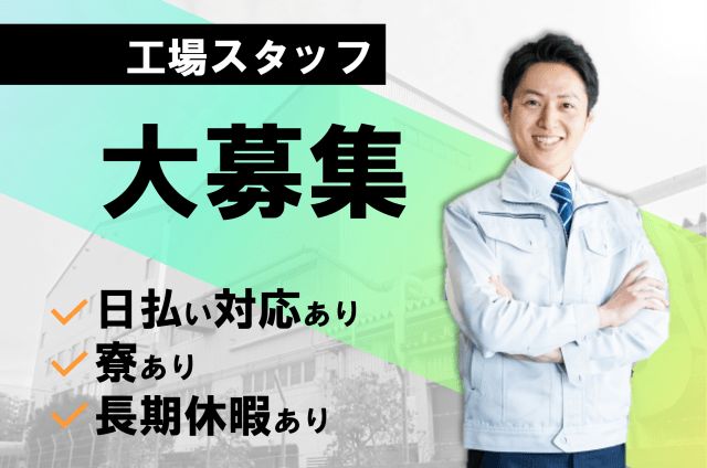 未経験歓迎/フリーター歓迎/交通費支給/フルタイム歓迎/駅チカ/学歴不問/20代活躍中/30代活躍中/長期(3ヶ月以上)/長期休暇あり/時給1000円以上/社会保険制度あり/日払い/週払い/制服あり/寮あり/履歴書不要/ブランクOK/職場が禁煙/勤務地固定/リモート面接OK/製造/工場