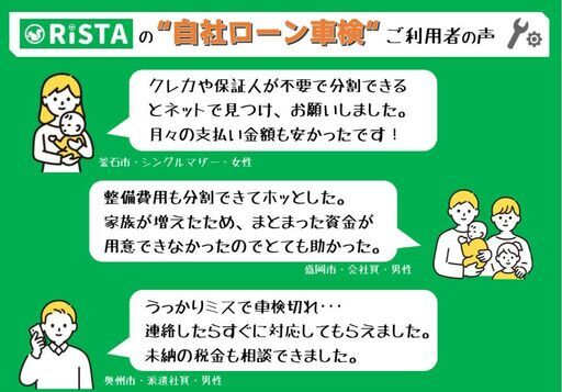 幅広いご事情に対応します👍・保証人がいない😢・クレカもない💳・ブラックリスト・・・💦それなら!当店の【自社ローン車検】をご利用ください!ローン会社やクレカを使わずに車検代の【分割支払いOK】😉◎保証人不要◎ブラックOK◎金利ゼロ\岩手・宮城全域対応/車検切れのお車でも大丈夫です💕諦める前にまずはご相談ください!★ご質問などはコチラからどうぞ↓ https://form.run/@risuta-syaken(申込ではないのでご安心ください)===費用に応じて選べる②プラン===❶『しっかり整備プラン』認証工場できちんとした整備をします🔧もちろん整備費用は分割OKです➋『とりあえず通すだけプラン』余計な整備や交換は一切ナシ!なるべく費用を抑えたい方に最適です===================★ご相談は公式LINEからもできます↓ https://lin.ee/nKX8sIl★お急ぎの方はお電話ください↓0120−925−057(9:00~20:00)★お車の「乗り換え」も当店で相談できます🚗【自社ローン&リース】ならローンが組めない方でもOK👏詳しくは公式サイトをご覧ください↓ https://ristaoshuiwate.wixsite.com/my-site
