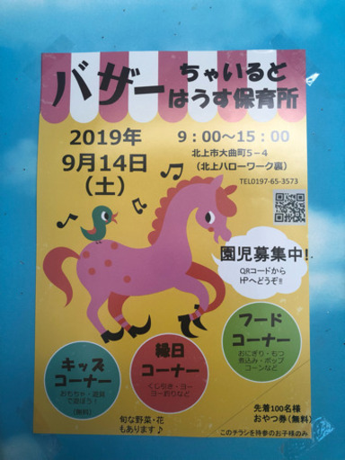 9月14日土曜にバザー開催します!キッズスペースも用意しています。来てくれたお子様にはおやつプレゼントいたします❤️縁日スペースやフードコーナーもあります!格安なお野菜、お花も用意しています。子どもたちの作品展示会も兼ねておりますので、園の様子など見にきて下さい。入園もお待ちしております😊