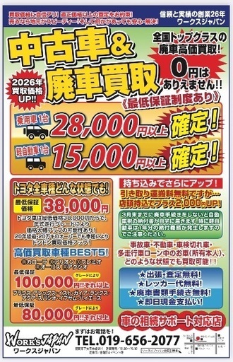 廃車 中古車 アルミホイール100%買取のワークスジャパン GETREYです。おかげさまで創業26年安心と信頼の地元買取店大手買取店と違い100万円以下は⭐️即日現金払い!!⭐️最低保証制度導入‼️◆アルミホイール◆4本 2.000円以上確定!※タイヤ付きは要相談ブランドホイールは査定士在籍の全国適正価格以上で高価買取致します。高年式純正ホイールも強化買取中◆中古車◆全国トップレベルの高価買取2026年 価格アップ!!買取最低保証価格!廃車買取‼︎即!現金払い只今!!!2026年 価格アップキャンペーン中軽自動車 15.000円以上確定!普通車 28.000円以上確定!さらに、、、基本引き取り料無料ですが店頭持込売却のお客様にはプラス2.000円上乗せ!!お急ぎ下さい!期間限定キャンペーン中にお得に売却!★今年度支払った自動車税も 月割の還付可能です。確実に0円引き取りはありえません。さらに......車検付き車両は車検残に応じて自動車税.重量税.自賠責 還付!買取価格に上乗せ致します。3月末までに抹消手続きしないと自動車税の通知がきます!※自動車税は廃車後 岩手県広域振興局より返金あります。※軽自動車は自動車税還付金制度は ありません。傷有り.不動車.事故現状車も完全に買取りします。県内廃車手続き、引取り無料☆秋田県、青森県のお客様は ご来店売却後、盛岡駅まで 無料でお送り致します。◇今が売り時!BEST◇最低保証価格 100.000円~グレードによりさらにアップ!〇プレミオ 〇アリオン 〇カローラ〇アクシオ 〇ハリアー ◯ハイエース★トヨタ 30プリウス強化買取中!!! 最低保証 前期モデル 80.000円以上!!後期モデル 15.0000円以上!!★トヨタ車強化買取車種アレックス イスト オーリス アクアガイア ランクス スパシオ イプサム最低保証80.000円~グレードによりさらにアップ!🔸壊れた ぶつけたでも トヨタ車!廃車・・・最低38.000円から買取ります10万キロオーバー、20年以上経過でも最低保証より価格上乗せの可能あり。■お車の相続や所有権でお困りの方■スピード解決!是非お問い合わせください🔹車の相続サポート対応店🔹⭐️通常査定ある愛車も他店、大型買取専門店 買取価格徹底対抗型査定!地域密着、26年の実績!地域トップクラスの高価買取を実現!最後に☎️ご連絡お願いします。買取り事業部!アルミホイール&中古車買取2026年も他店価格競争 勝率アップ目指します。古物営業許可 岩手県公安委員 211010000382