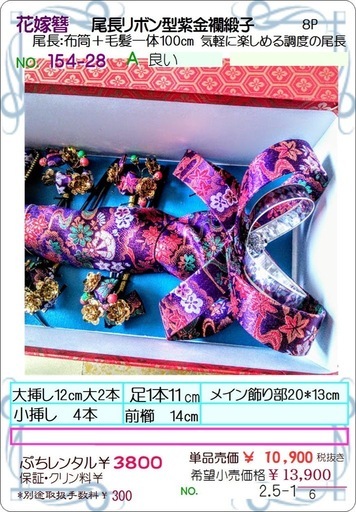 W.花嫁髪飾りぷちレンタル アプリ限定花嫁かんざしセットぷちレンタル¥3800#154-28 尾長紫金蘭緞子⚠︎着付け姿のサンプル画像は使用例でこの商品とは異なります★取扱手数料¥300が必要です取扱手数料は他にレンタルがある場合は不要 手数料は商品により異なり差額発生します☆1泊2日レンタル 前日お渡し 当日ご返却が通常ですアプリ申込み限定 店頭にてお受取お持ち帰りですお引渡し対応のスタッフは素人ですご質問はお申込み前に アプリ内メッセージにて承ります❥事前に商品をご確認頂くと安心ですご予約の場合は手付けをお願い致します❣️こちらの商品は販売も可能です 小売希望価格¥10,900 +消費税 店頭にて未開封での手渡し 試着不可☘お時間厳守できる方のみお取引させていただきます★こちらの頁ではご試着・ヘアセット等のサービスはついておりません手付金にて対応は可能ですので別途お申し込み下さい連絡先が不明確な場合は 貸出時に保証金をお預かりする場合がございます(レンタル品ご返却時に払戻し致します)☘プロフィールをご一読下さいませ#るんウェディングアイテム #るん花嫁かんざし#花嫁かんざし #花嫁簪セット #花嫁衣裳 #貸衣裳 #ブライダルアクセサリー #ウェディング髪飾り #ヘッドドレス #ウェディングアクセサリー #コスプレ