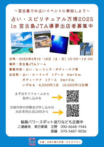 こんにちは 札幌占術の館六芒星の立野です。この度 【占い・スピリチュアル万博2025 in 宮古島JTA導夢】が沖縄県宮古島市で開催される事となりました。そこで 占い・ヒーリング・ボディーケア・飲食ブースに出店される皆様を100名大大大募集致します。2025年3月15・16日の2日間は みんなで宮古島に集合です。下記の仮出店申し込みフォームにご登録頂きましたら 公式ラインのQRをお送りいたします。こちらから本登録に進んでください。 https://sgfm.jp/f/f49d9a05824cdf383db83bbc548e1ca4神秘の島・神の島と言われる宮古島には 龍宮伝説や数多くのパワースポットなどがあり これを目的とした観光客もどんどん増えてきています。これを機会に 是非宮古島へお越しください。今からなら飛行機予約は断然お得です!!占術の館六芒星立野