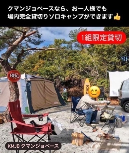 ★貸切りキャンプ場のご案内★薩摩川内市隈之城の自衛隊川内駐屯地近くに私設ミニキャンプ場『クマンジョベース』を開設しています。デイキャンプ、ピクニック、BBQ、宿泊キャンプ、野外パーティーなどお気軽にご利用頂けます。ソロキャンプも完全貸切りとなります。★入場料:大人お一人様①日帰りコース(10時〜17時) 1500円②宿泊コース(15時〜翌日10時) 2000円※日帰りでも17時以降は宿泊料金になります。※土日祝日の料金になります。※平日は200円引(子供は100円引)※小学生は半額、幼児は無料。※1組貸切になります。※テントの貸出しあります。(800円〜2000円)※テーブル、イスは貸出し無料。1日1組限定の完全予約制です。完全ソロキャンプはもちろん、カップル、グループ、ファミリーで贅沢な貸切キャンプをお楽しみいただけます。施設の詳細につきましてはインスタグラムで紹介しています。インスタグラム @kmjb_camp_discoやGoogleにて『クマンジョベース』で検索して下さい。@kmjb_camp_disco#クマンジョベース★交通アクセスJR川内駅から車で7分JR隈之城駅から車で3分南九州自動車道の都ICから車で4分3号線隈之城バイパスの自衛隊入口信号から900m近隣(車で7分圏内)にローソン、セブンイレブン、ドラッグストア、隈之城温泉、ジョイフル、プラッセだいわ、ダイレックス、ケーズデンキ、ホームセンタータカミ、ダイソー、テイクアウトの焼き鳥ジョー、焼きたてパン&カフェの果蔵などがあり、何かと便利な立地です。宝島ラーメンのチャルメラも呼んで現地で出来立てのラーメンも食べられます。★その他当施設には電気、水道施設はありません。ポータブル簡易水洗トイレは常設してあります。 洗い物用の水を12リットル蛇口付ポリタンクにて無料提供いたします。飲料水はご持参下さい。場内への車の乗入れ、車中泊も可能ですが、急勾配があるため、車高の低い普通車は乗入れが困難な場合があります。最大2トントラックまで入れます。場内乗入れが難しい場合にはキャンプ場の道路入口に駐車スペース(5台分)があります。クマンジョベースは多目的野外レンタルスペースとして様々なご利用方法があります。宿泊キャンプはもちろん、昼間の日帰りデイキャンプやBBQ、ピクニック。楽器演奏や練習、ミニライブイベント、フリーマーケット開催、ディスコパーティー、プロジェクタースクリーン上映、車の整備修理作業場、日曜大工作業場、趣味の作業スペース等々、使い方は無限大です。自宅で出来ない事が、ここではできます。⚠️お問い合わせ、施設のご予約はジモティのメール📩または、インスタグラムのDM📩からお願いします。@kmjb_camp_disco#クマンジョベース