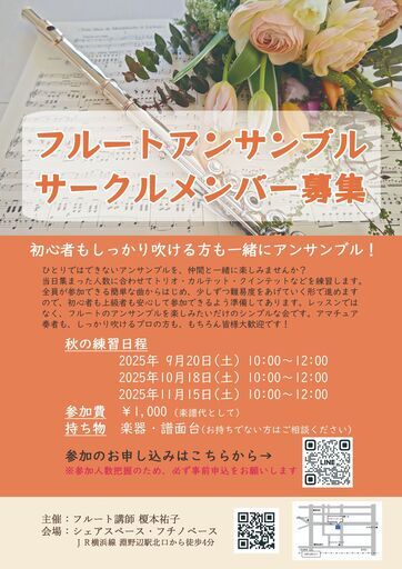 初心者もしっかり吹ける方も、一緒にアンサンブル!ひとりではできないアンサンブルを、仲間と一緒に楽しみませんか?当日集まった人数に合わせてトリオ・カルテット・クインテットなどを練習します。全員が参加できる簡単な曲からはじめ、少しずつ難易度をあげていく形で進めますので、初心者も上級者も安心して参加できるよう準備してあります。レッスンではなく、フルートのアンサンブルを楽しみたいだけのシンプルな会です。アマチュア奏者も、しっかり吹けるプロの方も、もちろん皆様大歓迎です!夏の練習日程・9/20(土)10:00~12:00・10/18(土)10:00~12:00・11/15(土)10:00~12:00参加費 … ¥1,000(楽譜代及び会場費として)持ち物 … 楽器・譜面台会場 … シェアスペース・フチノベース(神奈川県相模原市中央区淵野辺4丁目18-11) ※JR横浜線 淵野辺駅北口より徒歩4分程度参加申込 … 画像のQRコードで、教室の公式LINEにつながりますので、そちらからご連絡ください。また、この投稿にお問合せいただくか、 yusurayurayura@gmail.com へメールでお申し込みくだっても大丈夫です。会場の収容人数の関係で、事前にお申し込みくださった方のみ参加可能です。参加人数把握のため、ご協力をお願いいたします。主催 … フルート講師・榎本祐子(あおフルート教室)