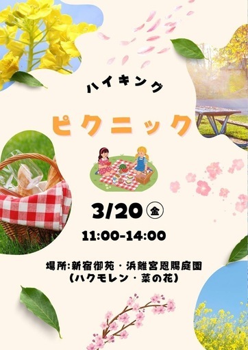 ピクニックしながら、菜の花を見に行きましょう🌼お話したい人やピクニックしたい人是非✨日付:3/20(金)時間:11:00-14:00場所:新宿御苑、浜離宮恩賜庭園参加費:入場料 500円