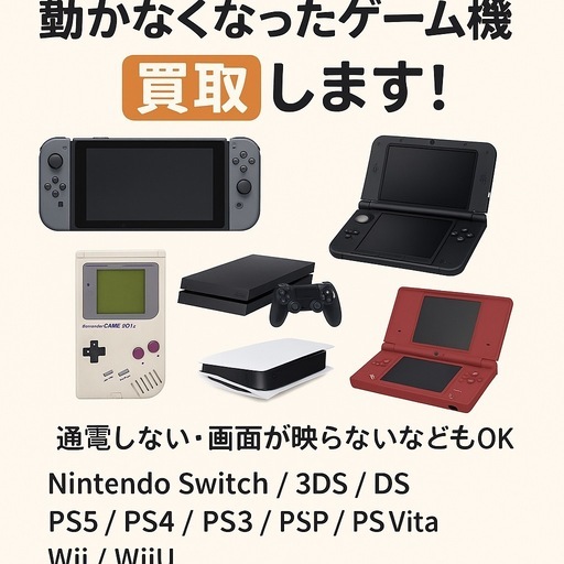 壊れていてもOK!動かなくなったゲーム機を探しています🎮通電しない、画面が映らない、ボタンが効かないなどでも大丈夫です。・Nintendo Switch・3DS / DS・PS5 / PS4 / PS3・PSP / PS Vita・Wii / WiiUファミコン ゲームキューブ ゲームボーイなどレトロからなんでもなど、どんな状態でもお気軽にご相談ください。部品取り・修理用として買取しています。神奈川県内であれば出張対応も可能です。ジモティのメッセージからお気軽にお問い合わせください✨
