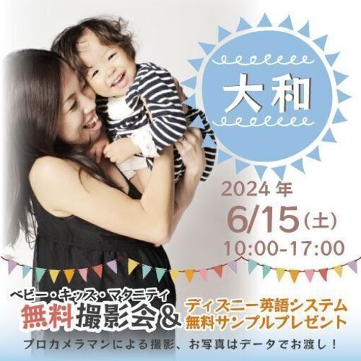 ◎マタニティママや0~6歳(未就学児童)のお子さまのいらっしゃるご家族をベビー・キッズ・ファミリー無料撮影会にご招待!撮影したお写真はカメラマンがチョイスした5枚分のデータをプレゼントいたします。✓ お着換えや衣装替えなども大歓迎!貸し切りでたっぷり撮影いたします。✓ 小物などのお持ち込みも大歓迎です。たくさんお持ちください。✓ お友達と、ご家族全員でなど、バリエーション豊富に撮影可能です。(撮影10分程度)※当日は販売・勧誘などは一切行いません。さらに今回は・・・季節ごとのディズニーオリジナルスクリーンをご用意いたしました! (予告なく変更になる場合があります)ディズニー英語システム・オリジナルの季節ごとの特別フォトセッション用背景を会場内に設置します。ディズニー背景前ではご自分のカメラやスマホでの撮影OK!お子さまと楽しく撮影してください!【当日は以下の感染症対策を行います、安心してご参加ください。】1. 撮影スペース内は入れ替え制です。(前後の組の進行状況などによっては多少重なってしまう場合がございます。)2.お客様が触れる小物などについては、一組入れ替え毎に消毒を行います。3.撮影前にスタッフも手指消毒を徹底します。4.定期的に室内の換気を行います。※各種対策は、感染しないことを保証するものではありません。【ご来場時のお願い】下記に該当する場合、ご参加をお控えください。1.撮影会当日、ご自宅で検温していただき、37.5度以上の発熱がある。2.体調がすぐれない、風邪のような症状や不安を感じている。《ディズニー英語システムサンプルプレゼント!》写真撮影後はタブレットを使用した簡単なアンケートにお答えください。もれなく「ディズニー英語システムサンプル+ミッキー&ミニー ミニトートバッグ」をプレゼントいたします。※当日は販売・無理な勧誘などは一切行いません。【お申込み方法】ご予約専用サイト https://www.pashalico.jp/event/yamatoよりご希望のお時間をご予約下さい。(スマホ・PC可)◎入れ替え制のため必ずお時間をご予約下さい。 ◎お友達様とご一緒のご参加も大歓迎です。ぜひお誘いあわせの上ご参加ください。(お友達様は続いたお時間をご予約ください)◎サイト内のアンケートにお答えください。 ※他サイト等でも受付けていますので、チケット枚数と残席は一致しません。必ずご予約専用サイトからお時間をご予約下さい。【ご注意事項】※今回のイベントはマタニティママおよび0~6歳(未就学児童)のお子さまのいらっしゃるご家族にご参加を限らせていただきます。※撮影会のみの参加はできません。撮影後、ディズニー英語システムのアンケートにお答えいただくことが参加条件となります。その場で無料サンプルをお渡しいたしますのでお受け取りください。ディズニー英語システムは、ワールド・ファミリー株式会社が開発・販売する幼児向け英語教材です。※恐れ入りますが、既にディズニー英語システムをご購入いただいているお客様はご参加いただけません。※無料サンプルのアイテム・デザイン・内容は予告なく変更になる場合がございます。※撮影したお写真は、約2週間以内にお申し込み時にご登録いただきましたメールアドレスにダウンロードサイトのアドレスをお送りいたします。サイトにアクセスしダウンロードしてください。★最少催行人数に満たない、緊急事態宣言の延長などにより予定していた会場施設が使用できなくなるなど、やむを得ず中止となる場合がございますことをご了承ください。