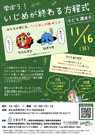 毎年好評の親子講演会を今年は子ども講演会として開催します。私たちが普段使っている「感じる」「比べる」という機能。お友達に対して「すごいなぁ」「素敵だなぁ」と感じることもあれば、「いいなぁ」「ムカつく!」と感じることってありますよね。更には、「自分なんか…」と卑下してしまうことも…。どうして私たちは、相手に対してイヤな気持ちや怒りが沸いてきたりするのでしょうか?また、そういう感情が沸いてきたら、どうしたらいいのでしょうか?子ども講演会では、「感じる」「比べる」「いのち」の仕組みを3パートに分けて、自分もみんなも自然と大切にできるコツをお伝えしていきます。お楽しみのゲームも用意していますので、お気軽にご参加ください。************************************【日時】2025年11月16日(日) 13:00~15:15 (受付12:45)【場所】みんなの学びガーデン COCOLEA 神奈川県秦野市南矢名 2丁目7−35 小田急小田原線 東海大学前駅 徒歩7分 (駐車場は先着5台まで)【参加費】1組1000円 事前Peatix申込み先着順【対象】小学4〜6年生とその保護者 10組【お申込みURL】 https://peatix.com/event/4598354/view (お子様の参加のご意志を確認の上お申し込みをお願いします。) 【後援】文部科学省 横浜市教育委員会 秦野市教育委員会 厚木市教育委員会 伊勢原市教育委員会 海老名市教育委員会【主催】未来の子ども達プロジェクト神奈川
