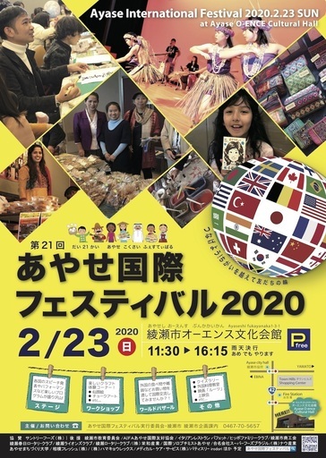 ☆第21回あやせ国際 フェスティバル☆■開催日程2020年2月23日(日)■開催時間11:30~16:15 予定■開催場所綾瀬市オーエンス文化会館駐車場無料!! 雨天決行!!■ホームページ http://mbjyq715.wix.com/ayasekokusaifestival■イベント内容☆スピーチ大会☆ゲストスピーチ アフマド アルマンスール(慶應義塾大学 総合政策学部訪問講師)☆パフォーマンス☆日本の遊び体験☆ミニ外国料理教室(要事前予約・試食付き) ・ブラジル料理教室 ・スリランカ料理教室☆ワールドフード&バザールコーナー☆ワークショップ☆クイズラリー☆行政書士 相談会☆映画「ルーツ」上映会などなど皆様のお越しをお待ちしております!!■お問い合わせあやせ国際フェスティバル実行委員会あやせ市企画課0467-70-5657