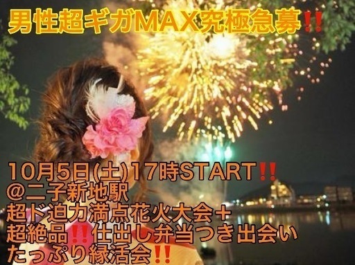(男性超ギガMAX急募‼️)【10月5日(土)17時〜二子新地駅】週末は超コスパ最強‼️‼️多摩川花火大会🎆でお友達・ご縁作り‼️【間近で見える‼️有利観覧席迫力満点花火大会+超絶品‼️仕出し弁当🍱+お酒などガッツリ飲んでコスパ最強3,500円‼️‼️】20,30,40代イベント(男性はLINE登録で7,500円) (投稿ID : 1cqc3r)