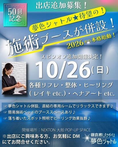 vol.50 夢色シャトル、10/26(日)スピンオフ開催(施術ブース)の出店者さんを募集しております。この機会にいかがですか。【施術ブース出店募集中】夢色シャトルに、待望の施術ブースが併設されます!占いブースと直結の別ルームになっており、リラックスできます。こじんまりアットホームな空間ですので、一日を楽しく過ごしたい方に人気のイベントとなっております。🔮募集カテゴリー簡易ベッドスペースでの施術や、各種リフレ、ヒーリング、レイキ、ヘナアートetc. ✳️当イベントはレディオ湘南でもCMが流れている安心のイベントです。 🟦HPの出店規約をお読みになり、先に出店枠の空きをDMにてお問合せください(必須)。空きの確認をせず直接ご登録されても許可されません。ご注意ください。その後、出店フォームからご登録となります。※DNAアクティベーション・RAS・包丁マッサージは募集外。その他募集外はホームページの出店規約をご確認ください。※個人活動の方に限ります。特定のスクール認定メニューなどでの出店はできません。HPはこちら→ https://luckybreak.online---------------------------鎌倉癒しパラダイス夢色シャトル主催者 KOHEIホームページ↓ https://luckybreak.online