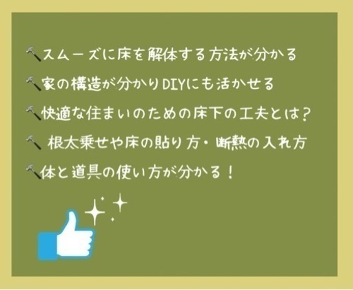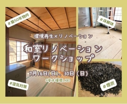 これからセルフリノベーション・DIYする方・したい方必見! 予算問題と快適さと居心地良さを同時に叶えるハイブリッドリノベ「ほどほどにこだわる」という選択。合板や断熱材は使い、仕上げは自然素材。今回は床の解体と、床下に埋炭と水脈を作り、湿気対策とイヤシロチ化に挑戦。床解体後の根太を乗せ、断熱、床貼りなどもやっていきます🎶 【内容】7/16・床の解体・床下に通気の点穴と氣水脈づくり・埋炭施工7/30・根太乗せ・床断熱・床の捨て貼り (フローリングを貼る前の床を貼る)※内容は、参加人数や解体時の建物の状態等によって多少変わります。 こんなことが分かります✨🔨リノベに必要な道具と使い方🔨床の構造🔨スムーズに床を解体する方法🔨快適な住まいのための床下の工夫🔨根太乗せや床の貼り方・断熱の入れ方🔨家の構造が分かり、DIYにも活かせますワークショップで使う道具は貸し出しも出来ますので、道具をお持ちでない方も安心してご参加いただけます🎵 しかも、今回は家の床下に磁場調整・環境再生的施工として点穴・氣水脈・埋炭を行う予定です🤩 滅多に無い(多分最初で最後の)機会なので、ご興味ある方はぜひぜひご参加ください!! 【講師紹介】たーちゃん解体工の経験を活かし、築50年の自宅を大規模解体しセルフリノベーション。幼少期より遊びを通して体と道具の使い方を身につけ、小柄な体格ながら手早く美しい解体を手がける。現在も一戸建てのリノベーション物件や古い木造倉庫の解体依頼などを受け、第一線で解体を行なう。 【詳細】 開催日 7月16日(日)、7月30日(日) 開催場所 草木循環Labo 平塚市城所310 開催時間 9:00-16:20(予定) 参加費 ¥10,000(単日参加は¥6,000) ランチ付 持ち物 汚れても良い服装・タオル2枚・ 軍手・汚れても良い靴 必要な方は着替え 貸し出し品あり:使い捨て防塵マスク・バール・ゴム軍手・スコップ 他 ※MYバールをお持ちの方はご持参ください お申し込み:メッセージにて参加人数をお知らせください。#セルフリノベーション #ワークショップ #築50年 #解体 #平塚市 #イベント #DIY