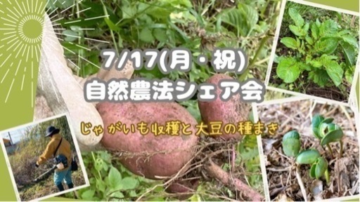 マクロとミクロの自然と調和し、たくさんの生き物たちと共に育てる自然農法。無農薬・無肥料・不耕起。そこにあるもので作物を育てる。連作障害ではなく連作奨励。そんな「農」や自然との調和、豊かさに興味をお持ちの方にオススメのシェア会です!自然農法の面白さが分かりやすく体感できるのがじゃがいもと大豆。自然農法のじゃがいもは慣行栽培のものに比べると収量が少なく小粒も多いけれど食べた時の力強さはピカイチ🤩今回は、そんなじゃがいもの収穫と、大豆の種まきを行います。そして久しぶりに郷間先生がいらっしゃいます😄室内講義はありませんが、畑のキャベツがいい感じなので、脇目で増やせる収穫方法や種のとりかたについてもレクチャーしてくださいます。※じゃがいもは一部お持ち帰りいただけます。【スケジュール】9:30 集合・じゃがいも収穫・畑整備12:30 ランチタイム・大豆の種まき・畑整備17:00 解散【詳細】日時 7/17 9:30-17:00集合 直接畑へお越しください 初めて参加する方は5分前に草木循環Labo集合 平塚市城所310参加費 ¥3,500(ランチ付)持ち物 軍手・鎌・筆記用具・マイカップお申し込み メッセージにて参加人数と 交通手段をお知らせください。