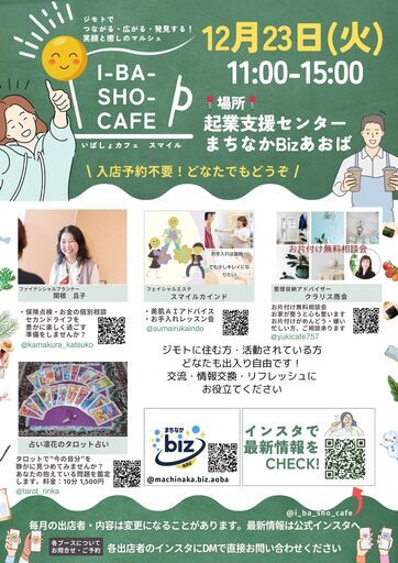 ジモトでつながる・広がる・発見する!笑顔と癒しのマルシェ「I-BA-SHO-CAFE」が新しい形になって登場します😊これまで毎月第3木曜日に「たまプラーザ・3丁目カフェ」さんで22回開催してきた“I-BA-SHO-CAFE”新しい試みとして【I-BA-SHO-CAFE スマイル】として、新しい会場・新しい日程で第2回を開催します🎉💡入店予約不要!どなたでもふらっと立ち寄っていただけます。◆日時2025年12月23日(火) 11:00〜15:00◆場所起業支援センター まちなかBizあおば(横浜市青葉区美しが丘1丁目13-10 吉村ビル) https://machibiz.com/@machinaka.biz.aoba https://www.instagram.com/machinaka.biz.aoba/?hl=ja◆入場無料◆イベントページ https://fb.me/e/3lZr0EROz👥 出店者😊ファイナンシャルプランナー 関根且子保険点検・お金の個別相談が出来ます(無料)セカンドライフを豊かに楽しく過ごす準備しませんか?@kamakura_katsuko https://www.instagram.com/kamakura_katsuko/😊フェイシャルエステ スマイルカインド・美肌AIアドバイス・お手入れレッスン会@sumairukaindo https://www.instagram.com/p/DPG3qdQkugC/?hl=ja😊60歳からのお片付けレッスン クラリス商会お片付け無料相談会お家が整うと心も整います😊お片付けがめんどくさい、嫌い、忙しい方、ご相談承ります。@yukicafe757 https://www.instagram.com/yukicafe757/?hl=ja😊占い凛花のタロット占いタロットで”今の自分”を静かに見つめてみませんか?あなたの抱えている問題を鑑定します。料金:10分 1,500円@tarot_rinka https://www.instagram.com/tarot_rinka/?hl=jaジモトに住む方・活動されている方ならどなたでも参加OK!交流・情報交換・ちょっとしたリフレッシュに、ぜひ遊びに来てください🌿 https://fb.me/e/3lZr0EROz最新情報はInstagramでCHECK!👉 @i_ba_sho_cafe https://www.instagram.com/i_ba_sho_cafe/?hl=ja★それぞれのメニューのご予約やお問合せは、各出店者のインスタにDMで直接ご連絡ください。★いばしょカフェ全体についてのお問い合わせはいばしょカフェのInstagramアカウントにDMでご連絡ください。😊笑顔あふれるひとときを一緒に過ごしましょう。お待ちしています!