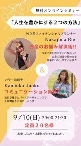 女性③人が主催👧👧👧参加者ほとんど女性ばかりのセミナーになっております☺️✨✨✨✨✨✨9/1020:00から21:30zoom無料✨✨✨✨✨✨独立系ファイナンシャルプランナーと色彩心理学の講師が初のコラボセミナーを開催☺️🫶初心者向けのお話で、聴きやすくアットホームなセミナーになっております😌✨✨お気軽に参加してください🙋♀️参加希望の方はメッセージください🙏お会いできるのを楽しみにしております✨✨