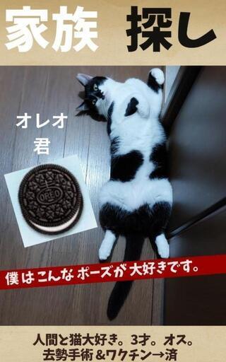 ◆性格や特徴フレンドリーな性格でとても良子いです。オレオ君は人の後ろから(腰あたり)座るのが好きです。写真のそのポーズが一番好きなポーズです。 飼い主が半年程前に亡くなり、遺族が猫嫌いな為そのまま飼うことができず, 保護しました、そして今オレオ君は新しい家族を探す準備ができています。 性格はとーっても人懐っこく、おっとりさんです。飼い主さんに愛情をたくさんもらっていたんだと思います。顔も柄も美味しそうなオレオクッキー見えます!◆健康状態毛並みがとても良く、健康状態も良好です。駆虫薬済です。去勢手術 手術済。ワクチン接種 接種済。◆その他大事な家族の一員となる子です。二度とこのような辛い境遇を味わってほしくありません。そのために大変心苦しいのですが、最低限の条件となりますのでご了承ください。1、家族全員が猫を飼うことに賛成である2、完全室内飼い、脱走防止を徹底する3、高齢者, 単身者等の方は後継人必須(相談下さい)4、横浜市県在住の方以上の条件に賛同いただける方はご連絡ください。まずは顔合わせ(ご自宅訪問必要です。)→トライアル期間(1週間~1ヶ月)→正式譲渡の流れとなります。 プロトコル間にはあちこち非常に多くがあります。まずは話せませんか、よろしくお願いいたします。