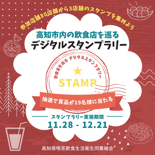 **2025年11月28日(金)~12月21日(日)**まで、高知市内の人気飲食店 20店舗 が参加するワクワクイベントを開催します!お食事やお買い物のあとに QRコードを読み取ってスタンプGET!3店舗分のスタンプ を集めると抽選応募が可能!抽選で 合計19名様 に素敵な賞品をプレゼント✨※賞品はお選びいただけません。ご了承ください。【参加店舗ラインナップ】土佐食彩空間タケノミチ彩とり鳥 HIROMATSU喫茶デポー菜園場店レストラン三木ドゥーブルぽえむトラットリアノンナ蛍橋食堂プラスメットカフェベリーベリースープmusubi茶夢石窯ピザ フェデリコモッチモパスタ 高知御座店香港四季楼 虎嘯すぷりんぐすレストランボルベールはこべ本店高見のたこ焼き 愛宕山店焼肉ぷるこぎ 高知店Reborn リボーンFika Bloom in(フィーカ ブルーム イン)美味しい料理を楽しみながら、スタンプを集めてワクワク抽選に参加しよう!この冬は、食べ歩き&お買い物で高知をもっと楽しむチャンスです✨👉 みんなで参加して、街を盛り上げよう!主催:高知県喫茶飲食生活衛生同業組合