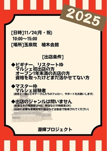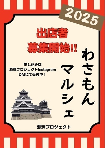 🎉\出店者さん募集中/🎉🌟“挑戦”を応援する「わさもんマルシェ」🌟自分の夢をカタチにしたい。新しく始めたことを、誰かに届けてみたい。そんな “わさもん” なあなたの一歩を応援するマルシェです✨🛍出店ビギナーさん・リスタートさん大歓迎!(もちろん経験者の方もOK)📌【開催概要】【ビギナー/リスタート枠】マルシェ初出店の方オープン1年未満のお店の方資格を取ったけどまだ活かせてない方【マスター枠(出店経験者)】自身も出店しながらビギナー、リスタートさんたちを運営と一緒に今までの経験を活かしてサポートしてくださる方※屋内での開催となります※飲食は調理NG、弁当や焼き菓子など物販OK🍱※出店に必要な営業許可や届出などは各自で取得されてください📩【応募方法】源輝プロジェクトInstagramのDMにてご連絡ください以下の内容をお知らせください👇————————————①屋号②代表者名③連絡先④出店内容(販売or体験など)⑤A:ビギナー/リスタート枠 B:マスター枠⑥電源使用の有無————————————⚠️応募期限は9/1(月)〜 増枠埋まり次第終了あなたの挑戦が、だれかの心を動かす🌱そんな一日を一緒に作りましょう✨#わさもんマルシェ#出店者募集#熊本イベント#挑戦を応援#ハンドメイド#ワークショップ#飲食出店#マルシェ出店#初出店歓迎