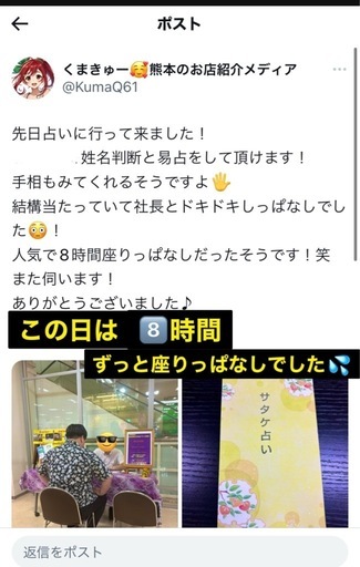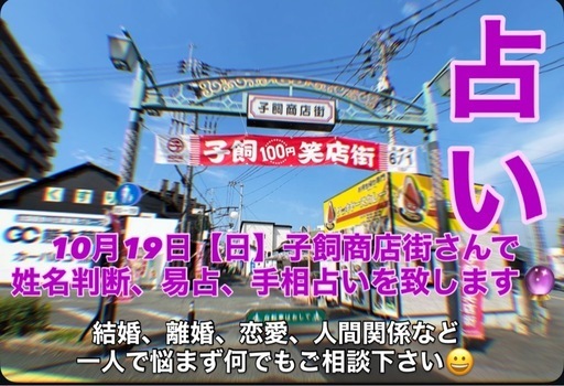 10月19日【日】子飼商店街さんで姓名判断&手相&易占を致します。当店は時間無制限制ですのでお客様が『心の底から納得するまで』占えます❗️また、料金は30分¥1000円、60分¥2000円ですので、リーズナブル価格で安心して占う事が出来ます😊結婚相談、離婚相談、金運、仕事運など一人で悩まず何でもお気軽にご相談ください^ ^※事前予約をご希望の方は、ジモティーからDMを宜しくお願い致します✨【インスタURL】 https://www.instagram.com/theg.reatsatake?igsh=MXY3M2c0ejQwNnltbA%3D%3D&utm_source=qr【インスタでの主な的中実績】① 石破茂氏の自民党総裁選当選②小池百合子氏の都知事選の再選③ トランプ氏のアメリカ大統領選挙の当選④現Juice=Juice川嶋美楓さんのベストパフォーマンス賞受賞⑤2025年夏の甲子園は、日大三高と沖縄尚学が準決勝を勝ち上がり決勝進出する⑥井上康生氏はFRIDAYに撮られても東原亜希さんと離婚する事はない。⑦2025年春の甲子園は、智弁和歌山と横浜高校が準決勝を勝ち上がり決勝戦に進出する。 ⑧楽天の田中投手は巨人に移籍したら活躍する⑨ 広末涼子の検査結果は陽性ではなく陰性である。⑩ 2025年7月、日本列島に大災害は起きないが、大きな台風が各地に直撃する。などなど