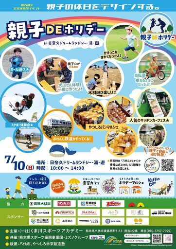 【シェア歓迎✨】来週日曜日開催!《7/10(日)親子DEホリデーin日奈久ドリームランドシー・湯・遊》◉親子で楽しみたい◎休日に大人もくつろぎたい◉近場で遊びたいそんな親子の皆さんには[親子DEホリデー]がオススメ!! https://www.mune-koubou866.com/2022/06/20/1491/⛺️親子DEホリデー🪵7月10日(日)10:00〜14:00日奈久ドリームランドーーーーーーーーーーーーーーー6月親子DEホリデー 雨の中完売して大好評!🥐やつしろパンマルシェ🍞キッチンカー🚚も大集合!●キッチンハル●808Dinner●Comida de batata●Minette●PICNIC deli●Good Good●WISH BONEーーーーーーーーーーーーーーー人気体験ブースも継続!💰体験ブース 1家族2000円💰🌲遊VIVAアウトドア🪵🚲へんしんバイク🚲🪵親子で工務店🏡🏃♀️かけっこ教室🏃♂️⚽️サッカー教室🏃♂️🎶スポーツリズム教室🎶🐙たこ焼き先生の体育教室🤸♂️🚃おれんじ鉄道ブース🚃ーーーーーーーーーーーーーーー〜青空カフェ〜🍛モルトグランデ🥪☕️coffee laboratory 香☕️ーーーーーーーーーーーーーーー🛹スケートボード体験🛹☆体験会☆各500円・スケボー・BMX・フリースケート☆スケートボードスクール☆・10時〜・11時〜1時間2000円ーーーーーーーーーーーーーーー💥同時開催イベント💥⛺️ホリデーマルシェ🪀ハンドメイド&フリマ 計14店舗親子DEホリデースポンサー店舗も3店舗出店!⭐揚八 美味しい唐揚げ⭐ASIS farm 美味しいお野菜⭐高見商店 フルーツサイダーーーーーーーーーーーーーーーーとりあえず盛り沢山!!帰りは日奈久温泉♨️で汗を流そう!!★同時開催★ホリデーマルシェ 出店紹介今回もたくさんのご出店ありがとうございます!!■あつきちの店小物雑貨のあつきちの店です。ここにしか無い、あなただけの1点物、素敵な掘り出し物が見つかるかもしれません(^-^)/■Miches-para(みぃチェスパラ)@miches_0408パラコードを使用したブレスレットやストラップ等を制作しています。強度があり切れにくいことから、御守りやプレゼントに最適です✨その場でオーダーをお受け出来ますので、お気軽にお声がけ下さい☺️親子でお揃いなんていかがでしょうか?☺️✨■ysk.famモノトーンハンドメイドマスク販売さま@ysk.famカジュアルな日常も品良く魅力的に。イエベさん向けのゴールドアクセサリーを制作しております。他にも子どもアクセサリー等をお持ちします。Instagramで人気の@maycocoとコラボ出店です♡■teku-tekuさま@misatekutekuチェコビーズを使ったアクセサリーをメインに作っています。ぜひ太陽の光に当てて見てください✨キラキラ繊細な色味を楽しんでいただけると思います!■ぱっそー工房さま@10ak0113子供から大人まで身につけられるものを作っています。高級なものではありませんがデザイン的に幅広くお手に取りやすいお値段です。■yudetamago.さま@yude_tamago15本物のお花を使用してアクセサリーや雑貨を制作しています💐お花一つひとつ色や形が違うため全て一点物の作品です💐■水兵メダカさま@medaka_no.6八代市千丁町でメダカの養殖、改良、販売をしています水兵メダカです。初心者の方やお子様でも安心してメダカを楽しめるように活動しております。是非この機会にメダカの世界にふれてみて下さい。■アキラmkハレルヤ まかなれあ手相、ハートグラム、筆跡鑑定、タロットカード占いフェロモンアップ ヒーリング®子宮ヒーリング妊活ヒーリング天然石アクセサリー販売■N’s777@handmade.n7主にレディース・キッズのアクセサリーを作成しています。シンプル・カラフル・個性的とさまざまなものをご用意しております。お気に入りが見つかりましたら嬉しいです*■おもちゃやけんちゃん@omochayakenchan射的、おもちゃくじ,ボールすくい子供から大人まで楽しめますよ!■グリーンコープガラポン抽選会⭐グリーンコープ商品のプレゼントとアンケートを行います。