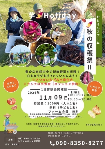 🍠芋Holiday おもけんファーム農園 秋の収穫祭2😋― 自然の中で“心もカラダもリフレッシュ”しよう! ―秋といえば“いも”の季節!そのまま農園では、家族みんなで楽しめる秋の収穫祭を開催します🌿自然に包まれながら、さつまいもや新鮮野菜を収穫✨笑顔いっぱいの1日を一緒に過ごしませんか?🍠 ここがポイント!🌾 1. 自然の中でのびのび体験普段はできない土いじり体験!子どもも大人も夢中になってしまう畑時間👩🌾👨🌾🍠 2. さつまいもお土産付き!自分で掘ったさつまいもをお持ち帰り🎁ほっこり甘いお芋をおうちでも味わえます♪🍲 3. ランチはみんなで芋煮会!(オプション参加)採れたて野菜とお芋でつくる“あったか芋煮”✨秋風の中で食べるごはんは格別です!📅 開催概要🗓 日付:2024年11月9日(日)⏰ 時間:①10:00〜12:00②13:00〜15:00📍 場所:〒861-1116 熊本県合志市福原833(桑鶴遺跡横)👛 参加費:大人:1,000円子ども:無料ファーム会員:無料🎁 お土産:さつまいも付き(約3kg)※今回ランチは御座いませんので、お弁当持参かお近くの外食をご利用ください。※春植え体験会参加者は無料🌿 こんな方におすすめ!✅ 自然の中でリフレッシュしたい方✅ 子どもに農業体験をさせたいご家族✅ 食や環境に関心のある方✅ 農ある暮らしを体感したい方📱 ご予約・お問い合わせ📞 090-8350-8277(担当:宮内義仁)主催:(株)おもしろい人生にしちゃいましょ研究所👉 SNSでも最新情報を発信中!「#芋Holiday」で検索してね🌈🍠 メッセージ手で土を触り、自然の恵みをいただく。その体験が、きっとあなたの心をあたためてくれます。家族と、仲間と、秋の思い出を“そのまま”の自然の中で。この日だけの特別な収穫体験を、ぜひご一緒に🌾