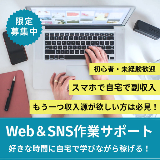 ■作業内容マニュアルに添った文字入力、求人記事作成、お問い合わせのメッセージやり取り、SNSの運営などになります。・初心者の方でも安心してお 仕 事していただけます・作業量に比例して報 酬 U P!が見込めます■活動時間ご自身の活動可能時間で、好きに働いていただけます。・長期的にお付き合いできる方を優遇します・業 務 連 絡をきちんととれる方を希望します・時間にルーズな方はお断りさせていただくことがございます■報 酬完 全 歩 合 制基本的にはご自身が得たい収 入 額に向けてお 仕 事をして頂きます。・お 仕 事のトレーニングもご用意しております・成長意欲のある方を募集しています■お 仕 事 開始までの流れアンケート審査↓ラ イ ン 説 明 会↓個別ヒアリング↓お 仕 事 開始■応募方法詳細をご希望の方は右上の『投稿者にメールで問合せ』からお問い合わせください