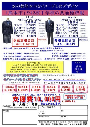 ・製造元につき他店より販売価格が1割ほど安い ・さらに早期グループ割11名以上でお1人様に5,000円交通費 お支払いします 15名以上でお1人様に6,000円交通費お支払いします 30名以上でお1人様に7,000円交通費お支払いします 50名以上でお1人様に8,000円交通費お支払いします 100名以上でお1人様に9,000円交通費お支払いします 150名以上でお1人様に10,000円交通費お支払いします 申込期限9月30日まで 採寸は12月・1月 同じグループでも採寸日は別々でOK!・3年間成長に伴う補正無料・店内制服展示しております。お気軽にご来店ください。ご不明な点ございましたらお気軽にご連絡ください。制服 学生服 ・当店の原点オーダースーツも好評承り中! 39,600円~583,000円 お好きな生地で好みのスタイルで心を込めてお仕立ていたします。
