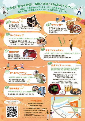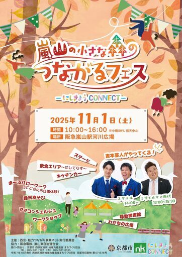 秋の嵐山に、ワクワクがいっぱいの1日がやってくる🎪✨『嵐山の小さな森のつながるフェス』🌳1日まるごと笑顔がつながるイベントです🍁開催は11月1日(土) 10:00〜16:00⏰場所は阪急嵐山駅すぐ・河川広場🌈秋風を感じながら、美味しい・楽しい・あったかい時間を過ごしませんか?みんなでつながろう!にしきょうCONNECT💚◆吉本芸人のステージや歌、演奏、ダンス、紙芝居などにぎやかなプログラムが盛りだくさん🎤✨◆キッチンカーやテントブースが勢ぞろい!バラエティ豊かなメニューが楽しめます♪◆親子で楽しめるワークショップ~作って持ち帰る、世界にひとつのたからもの~◆縁日あそび~手裏剣投げや射的、おもちゃすくいなど昔ながらの遊びを親子で楽しめます🎯◆ママコンシェルジュ~子育て世代にやさいい、安心のひとときを~◆まーるハローワーク(こどものお仕事体験)~子どもたちが自分で選び、働き、楽しめる特別な体験!◆移動図書館~地域に広がる、小さな図書空間~ 移動図書館(車)が会場にやってきます🚚💨◆飲食エリア~にしてらす~ 西京区の地元のお店による飲食ブースが並び、地域の味を楽しめる森のグルメ空間です🍪🌿