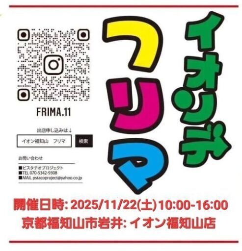 イオンでフリーマーケットin福知山♪募集開始2025年11月22日(土) 10:00〜16:00イオン福知山店!駐車場京都府福知山市字岩井79-8(来場無料)(雨天中止)出店お申し込みは↓ https://form1ssl.fc2.com/form/?id=d9b3b069ba5d2b8a事務局ピスタチオプロジェクトTEL 070-5342-9308mail pstacoproject@yahoo.co.jp#出店募集#飲食募集#イベント出店募集中#イオンでフリマ#フリーマーケット#フリマ#イオン福知山