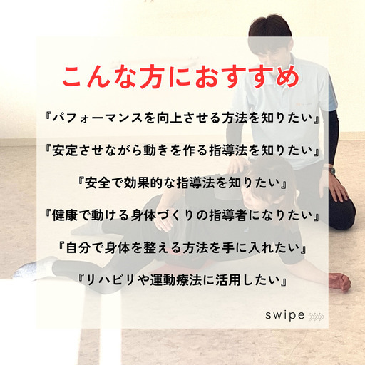 骨盤、股関節、胸椎へアプローチし、コアを安定させながらすぐにでも動きだせる体を作っていけるスイングストレッチの基本エクササイズ、スイングセブンを安全かつ効果的に指導ができるようになる3時間のセミナーです。