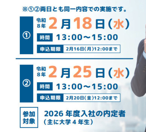 4月から新社会人として一歩を踏み出す皆さん、準備は進んでいますか? 「ビジネスマナーってこれで合ってる?」「学生と社会人の違いって何?」といった不安を、入社前にスッキリ解消しましょう! 京都府が主催する、2026年度(令和8年度)入社予定の方を対象とした完全無料のオンライン講座のご案内です。■この研修のポイント・参加費は無料(内定者の方ならどなたでも参加できます)・オンライン開催でご自宅からリラックスして参加可能! 「身だしなみ」から「キャリアビジョン」まで、実践的な内容を2時間で凝縮して学べます。 ■研修内容(カリキュラム) 社会人に求められるビジネスマナー 身だしなみ、言葉づかいなどの基本をチェック 社会人マインドセット 学生と社会人の違い、「ビジネスに求められる8つの意識」を伝授 入社後について 「私のトリセツ」や「キャリアビジョン」の作成で、入社後のイメージを具体化 ■開催日時※両日とも同一内容。ご都合の良い日程を選んでください。 令和8年2月18日(水) 13:00~15:00 申込期限:2月16日(月) 12:00まで 令和8年2月25日(水) 13:00~15:00 申込期限:2月20日(金) 12:00まで ■対象者 2026年度(令和8年度)入社予定の内定者 ■お申込みはこちら https://recurrent-kyoto.com/news/6210/<お問い合わせ> 京都府生涯現役クリエイティブセンター 電話:075-741-8600 メール: info@kyoto-digiplat.jp