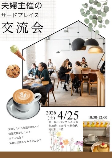 夫婦で主催してる交流会です!☀︎社会人になってからの友達作りたい☀︎朝から良い時間過ごしたい☀︎異業種の人と繋がりたい☀︎ホッとする場所を見つけたい☀︎プライベートを充実させたい☀︎趣味友欲しい目的は様々だと思いますが一歩踏み出すきっかけにご参加下さい!リアルな人との繋がりは日々の彩りが増えますよ💡