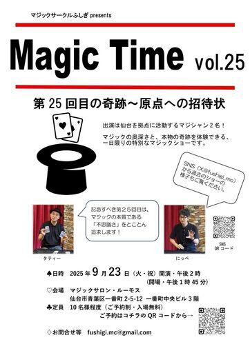 マジックサークルふしぎ主催、恒例の小さな小さなマジックショーです!目の前で起こる、不思議で楽しいひと時。おかげ様で、25回目の開催となりました。マジック・タイムVol.25 ~第25回目の奇跡。原点への招待状~日 時 2025年9月23日(火・祝) 14:00~15:00 (開場13:45)会 場 マジックサロン ・ルーモス(Lumos Magic) 仙台市青葉区一番町2丁目5-12 一番町中央ビル3F会 費 無 料パフォーマーはタティー、にっぺの2名です。記念すべき第25回目は、マジックの本質である「不思議さ」をとことん追求します。私たちは、マジックの原点に立ち返り、シンプルな道具に秘められた、長きにわたって人々を魅了してきた奇跡を皆さまにお届けします。言葉は要りません。ただ、不思議な現象を目の当たりにしたご自分と、じっくり向き合う時間をお楽しみください。マジックの奥深さと、本物の奇跡を体験できる一日限りの特別なショー。お申込は添付チラシのQRコード、または下記のリンクよりどうぞ。(完全予約制です) https://x.gd/rJCAI会場にて皆様とお目にかかれることを、楽しみにしております。感染症対策を万全にして開催いたします。