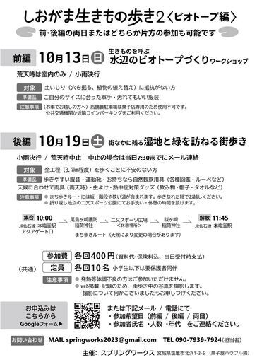 しおがま生きもの歩き2<ビオトープ編>■後編: 10月19日(土) まち歩き 塩竈市の中でも貴重な湿地環境がある二又スポーツ広場を目指して、生きもの探し&観察をしながら歩こう!ふたつの高台の神社にも立ち寄ります。※階段や坂道を通ります【要申込】(必ず下記の方法からお申込みください)■ナビゲーター小倉祐 塩竈在住の生き物・自然好き。 最近は自宅で小さなビオトープを作ったりしている。 2級ビオトープ管理士(計画・施工)、NACS-J自然観察指導員。釣舟富紀子 Twitter(X): F_sogm 塩竈在住の生き物好きの画家。 市内をモデルにした作品に川沿いの風景が多い。■開催日10月19日(土) ※荒天時中止 / 小雨決行 中止の場合は当日 7時30分 までにメールにて連絡いたします。■スケジュール ※天候等により変更の場合があります集合 10:00 JR仙石線 本塩釜駅 アクアゲート口 ↓ 尾島ヶ崎護防稲荷神社(尾島町) 二又スポーツ広場(新富町) 祓ヶ崎稲荷神社(尾島町) ↓解散 11:45 本塩釜駅■定員: 10名 ■対象: 全工程(3.7km程度)を歩くことに不安のない方※小学生以下は要保護者同伴■参加費: 400円(資料代・保険料込)※当日受付時にお持ちください。■準備物: 歩きやすい服装・運動靴(サンダルは不可)・雨具(雨天時)・虫よけグッズ熱中症対策グッズ(飲み物・帽子・タオルなど)お持ちなら自然観察用具(各種図鑑・ルーペなど)■注意事項・まち歩きルートには坂・階段や狭い道が含まれます。歩きなれた靴でお越しください。・折り返し地点の二又スポーツ公園にてお手洗い・休憩の時間を設けます。・発熱等体調不良の方はご参加いただけません。・web掲載やイベント記録のため、街歩き中の写真を撮影します。撮影について何かございましたらお申しつけください。【お申込み方法】下記URLのフォームにご入力くださいGoogleフォーム https://forms.gle/bGqqma5QyEwXVJwQ6【お問い合わせ先】メール springworks2023@gmail.com公式LINE https://lin.ee/xqD2PtA (こちらからのお申し込みも可)電話 090-7939-7924(担当者)【関連情報】主催元SNSスプリングワークス/菓子屋ハウフル Twitter(X) / Instagram : springworks2023