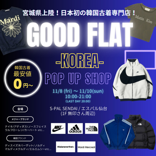 韓国ブランド古着店『グッドフラットコリア』は、宮城県仙台市で3日間限定ポップアップストアを開催することを決定いたしました。■グッドフラットコリアとは?韓国国内で流通している若者に人気な古着で構成された『韓国古着専門店』現在日本の古着店舗ではみない韓国ブランドで構成されています。日本人バイヤーが、日本で流行している最新のファッショントレンドを取り入れ、日本人の好みにあったセレクトを行っています。■大盛況につき全国ツアー決定!!2024年3月に栃木県宇都宮市で開催されたポップアップストアは、連日大盛況のうちに幕を閉じました。 この度、多くのお客様からの熱いリクエストにお応えし、ポップアップストアの全国ツアーを開催することが決定いたしました。 2024年10月は、水戸、宇都宮にて再び開催が決定。 11月には、群馬、宮城、秋田、福島と東北地方を巡り、12月には福岡へと、全国各地を巡ります。来年2025年も、全国ツアーを継続し、皆様のもとへお伺いできるよう、鋭意準備を進めていきます。全国各地で、皆様との素敵な出会いを心より楽しみにしております。■韓国流行りの写真機や豪華ノベルティも!この度開催されるポップアップイベントでは、韓国で話題のレシート写真機が登場!レシートのようなかわいいモノクロオリジナル写真を撮影できます。レトロかわいいデザインがSNS映え間違いなしです✨思い出に残る一枚を、ゲットできちゃいます!韓国らしいトレンドアイテムが満載の店内で、思う存分ショッピングをお楽しみください。レシート写真機で撮影した写真は、SNSにアップして、お友達にも自慢しちゃいましょう!さらにはポップアップ限定ノベルティや朝限定特典もご用意!3点以上お買い上げでボリュームマフラープレゼント! 数量限定なのでお早めに!他にも、嬉しい企画が盛りだくさん!朝早くにお越しいただいたお客様には、お得なクーポンプレゼント企画や0円でゲットできる古着も店頭に数量ご用意しております!■ポップアップショップ開催概要<宮城>会場:エスパル仙台 1F ( 周辺:無印 )住所:宮城県仙台市青葉区中央1-1-1日程:2024年11月8日(金)~11月10日(日)[営業時間] 10:00~21:00 (最終日20時まで)【HP】 https://anewinc.co.jp/【ONLINE STORE】 https://goodflat.net/【Instagram】 https://www.instagram.com/goodflat_korea/ 【TikTok】 https://www.tiktok.com/@goodflat.kr【X】 https://x.com/goodflat_korea