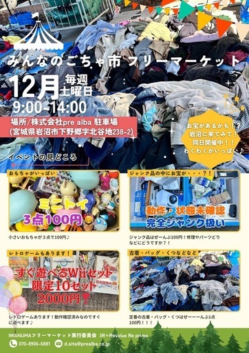 ※ハウマッチのフリマ営業時間早めました。画像と異なります。ご注意ください。みんなのごちゃ市フリーマーケットさんと同時開催です!!■ 27日 土曜日(ハウマッチ)リユースショップハウマッチのフリーマーケット古着、食器、ギフト、子供服、雑貨など種類豊富で、毎週宝探し気分♪毎週ラインナップが変わる人気イベント!宮城県岩沼市竹の里 1-12-1010:00~14:00雨天決行いたします!■ 27日 土曜日 (pre alba)大量の古着・バッグ・靴を”すべて100円"で大放出!古着の量がとにかく多くて、お宝探しに最適土曜と日曜で同じ古着は並ばないので、2日連続で楽しめる!仕入れに最適!■ 28日 日曜日 (pre alba)“みんなのごちゃ市"開催!ジャンク品、ゲーム機、家電、フィギュア、雑貨...とにかく何でも出てくるオールジャンル市!もちろん土曜とは違う古着も放出!その日により品物は変わります* 住所:宮城県岩沼市下野郷字北谷地238-2* 9:00~14:00* 気合いの雨天決行!!!土日は岩沼でフリマ巡りするのが最高です!防寒対策をなさっていらしてください!お待ちしてます!!