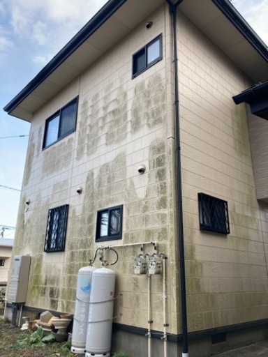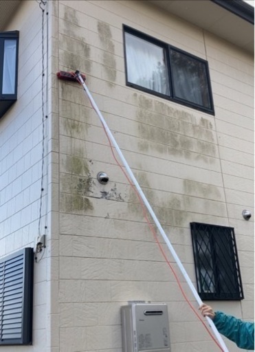 苔、カビ、青藻、油汚れ、特殊なバイオ洗剤で、ブラッシングしながら洗浄する方法です。私たちの使う洗剤は塗装やアルミサッシなどを腐食させてしまう塩素系のものではなく、草花やペットにも優しい洗剤を使い、外壁をクリーニングする方法で行います。外壁塗装することを考えるよりまず1度、洗浄してみませんか。費用効果抜群ですよ。1㎡を1000円でお試しでテストしていただけます。納得していただけると思います。概ね、家全部は48000円で洗浄できます。一面のみですと18000円で施工できます。家の大きさで多少の金額は上下します写真のお家は18000円(税込)です。一面のみです。ご相談、お見積もりは無料でさせていただいております。