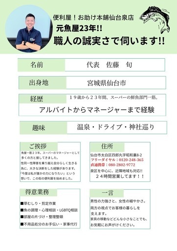 元魚屋の便利屋【便利屋!お助け本舗 仙台泉店】です!!「家具一点だけの移動」「洗濯機・冷蔵庫の設置」「家具組み立て」お任せください!!・どこに頼めば良いか分からない・家族や友達などに頼めない・自分1人だけでは出来ない・大人数が必要になる・遠くて行けない・夜が遅い、朝が早い・お手伝いして欲しい・聞いて欲しい、聞きたい・何かをして欲しいこんなときは、お気軽にご相談下さい!作業費3300円(1時間)(税込)出張費2200円(税込)車両費3300円(税込)〜作業可能です!!見積り・ご相談は無料。即日対応も可能です。地域密着で、安心・丁寧・迅速なサービスをお約束します。【対応エリア】仙台市泉区・宮城野区・名取市 ・岩沼市など宮城県内【対応サービス】掃除代行/草刈り/片付け/不用品処分のお手伝い/雪かき/買い物代行 ほか詳細・お問い合わせは下記からお気軽にどうぞ!👇☏0120-248-365(24時間受付中!!) https://otasuke248.com https://lin.ee/ysIUYVh4