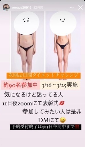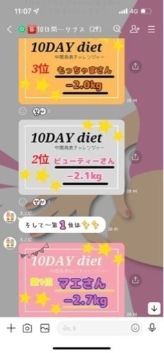 たった10日間しかないダイエットチャレンジ企画!!現在total 60名以上で助け合い頑張るオープンチャットダイエット♫【内容】 10日間ダイエットチャレンジ!!☆1人ではなく!同じ悩みを持つグループダイエット【オススメの方】☆1人では続かない☆早く痩せたい☆ダイエット仲間がほしい☆みんなでなら頑張れる!☆10日間ならできるかも!☆ダイエットの参考にしたい!【重要】2クラスあるのでどちらに参加するか決めて下さい♫🅰️クラス置き換え食を上手く活用しながら安全にしっかり結果のダイエットサポーターと一緒に頑張るクラス!!通常価格 11644円初回のみ ✨7822円✨33%OFF🅱️クラスまずは自分の力でとりあえず頑張るクラス💪運動でも!夕食抜きでも!!参加費 0円【参加条件】①匿名(ニックネーム)での参加②毎朝計測し体重報告③10日間必ずやりとげる!【場所】 限定オープンチャット(自宅からの参加)☆表彰式☆もあります!参加するか悩んでる人はぜひ見てみてください✨✨【今までの参加者の声】🅰️クラス☆ここまでサポートしてくれて10日間でこれなら続けられた☆悩みを種を解決してくれた!☆10日間で-3.5キロ落ちて周りから痩せたと言われた☆ダイエットトレーナーが優しかった☆10日間と言わず2クール目も受けたい!!☆食事の大事さの認識ができた!🅱️クラス☆自分を見直すことができた!☆続けられた事が嬉しかった☆毎日のランキングで頑張れた!☆みんなで頑張れた【Q&A】Q.1 この企画は何度もありますか?A.1 毎月1日/16日にあります♫Q.2 何度も参加できるのでしょうか?A.2 🅱️クラスは最大4クールで卒業、🅰️クラスは自身の結果に満足するまで何クールでも可能Q.3 途中から🅱️→🅰️に編入できますか?A.3 基本的には出来ません💦なので次回から🅰️クラスへ招待しますQ.4 途中でやめてもいいでしょうか?A.4 お任せしてます♫引き止めません😊1番は本人がどうなりたいかなので♫Q.5🅰️クラスは置き換え食だけの食事だけですか?A.5 普段の食事もしっかり入れてもらいます😊ご興味ある方は個別でしっかり方法を伝えてます♫Q.6 🅰️クラスはみんなどのくらい体重落ちるんですか?A.6 個人的差はあまりますがこの2月で最大-5.6㌔!アベレージ2.1〜2.5kgは落ちてます🍀Q.7 🅰️クラスと🅱️クラス何人ぐらい参加されてますか?A.7 🅰️クラス40名 🅱️クラス40名です参加ご希望の方はメッセージに「🅰️クラス希望」 「🅱️クラス希望」どちらかを送ってください♫画像は実際の投稿画像です!参考にされてみて下さい♫みんな楽しくやってます☺️たくさんの方々がいますので1人で頑張れない方は是非参加されてみてください🌸表彰式があるので詳しい説明も兼ねて聞きたい方はzoom🆔とパスワード発行します🍀