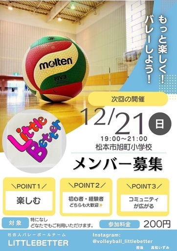 一緒にバレーしませんか!?バレーが上手くなりたいバレーしたいけど人数が集まらないバレーしたいけど体育館取るのが大変バレーしたいけど他のところに行くのが難しいそんな方、是非、新しいチームでどうですか?松本駅周辺で体育館を取り、バレーがしたい人の為にチームを作って毎週活動していきたいと考え、一年が経ちました…が、メンバーは安定せず、古株の圧がすごいなどということはありません来たり来なかったりもかなり自由です!みんなで楽しく…でも上手くなりたい!という気持ちの人がほとんどの中、練習を行なっています!平日の夜を中心に活動を行っています。どんどん人を集めて活動していきたいと考えています♪今集まっているメンバーは初心者、経験者が混ざる、若い人多めのいろんな人が集まるチームになっています!どんな人も気兼ねなくお越しください!日時:12月21日(日)場所:旭町小学校時間:19:00〜21:00参加費:200円みんなで楽しく!バレーしませんか?動きやすい服装、体育館シューズ、タオル、水分忘れずにお持ちください!たくさん友達連れてくれる方、大歓迎です✨!是非お待ちしております😊できるだけメッセージへのご連絡をお願いいたします🙇♀️節度あるメッセージのやりとりをいただけると幸いです☺️※お仕事の都合や、学校の都合など、遅れて参加や少し早く帰るなど、していただくことも可能です!なんでも相談してください!※参加費等で利益が出てしまった場合は今後の運営の必要費用として適切に使わせていただく予定です※宗教及び他団体への勧誘、場を乱すような行動等される方のご参加はご遠慮いただきますよう、お願い申し上げます。