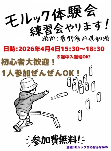 モルック体験会のお知らせです📣話題のモルック!気になったらやってみましょう!場所:長野市 豊野屋内運動場日時:2026年4月4日15:30〜18:30参加費:無料◎初心者大歓迎🔰◎1人での参加もぜんぜんOKです🙆♀️-----------------------------------※特に年齢制限は設けていません。ご自身で350g程度の木の棒を5mくらい投げることが出来るなら小さなお子さまやご年配の方、車椅子の方でも体験いただけます!必要に応じて介助の方とご一緒いただくか、ご相談ください。また、お子さまの場合は保護者の方同伴でお願いいたします。※プライベートイベントのため保険等は加入してません。必要であればご自身で加入してください。-----------------------------------動きやすい服装の方がより楽しめます♪自身の飲み物があればよいかと思います!参加希望の方は当日いきなり来ていただいても構いませんけど、出来れば前日までにこちらに参加表明くださいませ!#モルック#モルック体験会#ユチ君 #長野市イベント