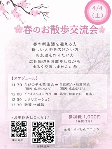 4/4 イベlabココカラ周辺を歩いてお花見(運が良ければ…)する交流会を企画しました🌸新生活でお友達が欲しい方大歓迎✨美味しいお弁当付きです🙏残席少ないので、お早めにお申し込みください❣️😊(2枚目QRコードより申し込みにお進みください)#イベlabココカラ#交流会🔻お申し込みフォーム https://docs.google.com/forms/d/e/1FAIpQLSeLfiHmie0gJLwANU7i-HFtMBfTYo0AH6ur6BiRqgBbHsms4Q/viewform