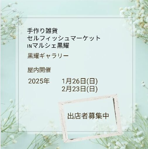 🌿 出店者募集中 🌿手作り雑貨*セルフィッシュマーケット inマルシェ黒耀(黒耀ギャラリー)2025年 1月26日(日) ❌〆切ました 2月23日(日)屋内開催会場 道の駅マルメロの駅ながと 信州長和町マルシェ黒耀 黒耀ギャラリー開催時間 10:00 〜 16:00搬入 9:00頃〜出店料 1ブース 2000円 当日払い 間口1.8m 奥行1m テーブル 丸イス付 ❶ 180×90cm ❌ 2月分〆切 ➋ 120×80cm ❌ 2月分〆切 ❸ 80×80cm×2台 ❹ 持込み✳希望にそえない場合もあります✳持ち込み していただく場合あり*ワークショップもOK! (内容・所要時間・金額お知らせください)🔴希望日・希望ブース お知らせください⚠️著作権に反する物は出品できません⚠️開催時間16:00までは退場できません 特別な事情がある方はご相談くださいよろしくお願いいたしますセルフィッシュハンズ おの