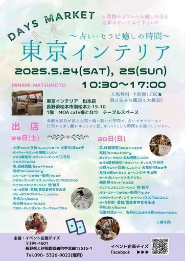 長野県松本市の東京インテリアさんにてハッピーデイズマルシェです! ステキな家具や雑貨のお買い物ついでにマルシェもお楽しみください!♦日時2025年5/24(土)5/25(日)10:30-17:00定員になりましたので、募集は締め切りました。 #イベント企画デイズ#イベント情報#デイズマーケット#占い#ハンドメイド#リラクゼーション#長野県#松本市地域活性化頑張る人を応援するイベントハッピーデイズマルシェです!南松本駅近のお洒落な家具屋さん《東京インテリア松本店》さんのカフェコーナー内でのイベント開催です!お気軽にお立ち寄りくださいませ!♦日時5/24(土)25(日) 10:30-17:00♦www.tokyointerior.co.jp東京インテリア家具 松本店〒390-0832長野県松本市南松本2丁目15-10ハンドメイド雑貨販売、ワークショップ、占い、リラクゼーション、セラピーなどなど◆主催 お問合せ 長野県上伊那郡箕輪町中箕輪12535-1 イベント企画デイズ 09053269022(代表 堀内)