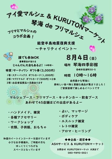 琴海四季彩館のフリマとマルシェのコラボ企画を8月4日(日)に開催します「アイ愛マルシェ&KURUTONマーケット 琴海deフリマルシェ」今回も自然豊かな琴海に美味しい食べ物と素敵な商品が集まりました。ご家族皆様で楽しめるイベントです会場:琴海四季彩館時間:10時~16時住所:長崎市長浦町50-5フリマブース&マルシェブース、キッチンカーの出店で45店舗ほどの出店があります※出店希望の方はお気軽にお問いあわせください今回も豪華景品がGETできる「じゃんけん大会」があるよー・特賞:サーティワン ギフト券(3,000円分)・1等:スターバックス ギフトカード(1,000円分)・2等:マクドナルド ギフトカード(500円)×2本・3等:出店者様協賛品×多数あります会場に和室のイートインコーナーを設けています。ご年配のお客様、小さなお子様連れのお客様も安心してお楽しみください※雨天時も開催しますよ【今後の開催日程】9月1日、10月13日、11月3日、12月1日すべて日曜日開催です【お問い合わせ】KURUTONマーケット 大渕mail kuruton999@gmail.com携帯電話:080-9890-0021