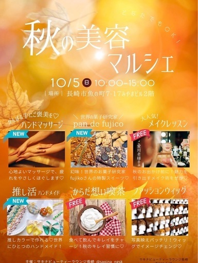10月5日日曜日サキナビューティーラウンジ長崎でマルシェやります‼︎ 〒850-0874 長崎県長崎市魚の町7−17 みやまビル 2Fキアヌリーブスも訪れる❣️LAのレストランに10数年勤務されてたpandefujiko さんの焼き菓子も販売されます‼︎メイクやウィッグお試しもありますんでお気軽にお越しくださいませ☆