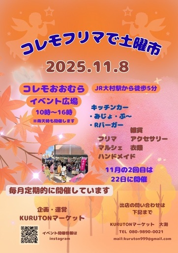 大村市の中心部で毎月定期的に開催しているフリーマーケットです。11月の開催日は8日(土)・22日(土)に開催します2025年11月の開催日8日(土)コレモ・フリマで土曜市 22日(土)コレモ・フリマで土曜市 会場はJR大村駅から徒歩5分のアーケードに隣接した商業施設「コレモおおむら」大村の中心地にあり、スーパー、和菓子店、パン屋さん、定食屋さん等に隣接した屋根付きのイベント広場です。県立図書館「ミライon」も近く、幅広い世代の方々が行き交う場所です。イベント開催中は前面道路が歩行者専用道路となりますので小さいお子様連れでも安心ですよ!毎回、衣類、雑貨、おもちゃ、手作り雑貨などなど色んな商品が集まっています。ワークショップ出店、各種マッサージ、占い等の出店も可能です。※禁止品:コピー商品、違法品、危険物、薬品、生物、その他公序良俗に反するもの、食品等は要相談!区画:1区画 2.5m×2.5m出店料:1区画:2,000円 2区画:3,500円 キッチンカー:3,500円イベントタイム 10時〜16時受付、搬入9時00分~雨天開催持込テント設置可能机、椅子の貸出し(有料)【申込、お問い合わせ】KURUTONマーケット 大渕mail kuruton999@gmail.com携帯電話:080-9890-002Instagram https://www.instagram.com/o.ofuchi/
