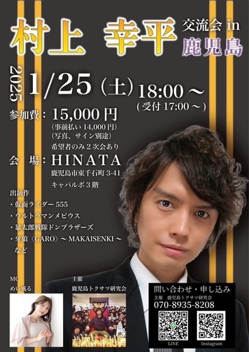 🔥村上幸平交流会in鹿児島🔥開催決定🌈 仮面ライダーファイズでライバルの草加雅人、仮面ライダーカイザを務め、その後もテレビドラマなどで活躍を続ける、芸能界1のザリガニマニア、村上幸平さんをお招きして交流会を開催する事が決定しました🔥皆さん奮ってご参加ください!⚠️申込、問合せはDMまで!💥日 付:2025年1月25日(土)💥時 間:18:00(受付17:00-)💥参加費:14,000円 (当日券15,000円)