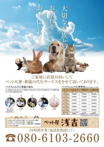 大切な家族であるペットちゃんを亡くされてお辛い上にこれからどうすればいいか分からない、高齢者の方やお忙し中、家族一員のように飼われていた会社勤めの人等お客様は多いと思います。ペット屋浅吉では私達が24時間365日いつでも待機しています。お客様の目線に立ったご対応とご提案を丁寧にご説明させて頂きます。お引き取りや火葬日に関してはお客様とご相談させて頂きお伺いさせて頂きます。また、今すぐ葬儀をお願いしたいという場合も、ご遠慮なくご相談ください。ペット屋浅吉では、早朝・深夜問わずお電話の対応をしております。ご自宅またはご指定の場所に、ペット屋浅吉のスタッフがお伺いします。お客様のお気持ちになり、お客様の大切なペットちゃんの葬儀を親切・真摯・丁寧に行わせていただきます。また、葬儀前にもご質問やご不明点などございましたら、お気軽にお申し付けください。